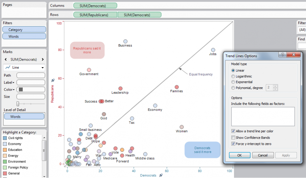 The solution, when it finally hit me, was a simple as anything. To do it, I just used a dual axis plot of Democrats plotted against Democrats, with the multiple mark type for Democrats (line size) dropped all the way down and a trend line added with a forced (0,0) starting point. That’s a mouthful, so here’s a screenshot of the sheet: