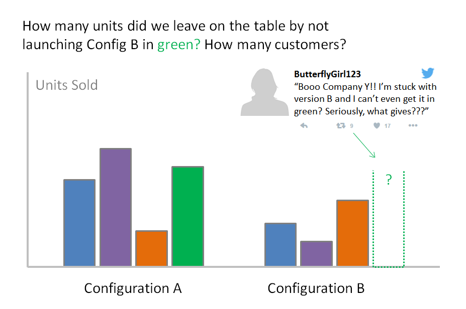 Do you notice the problem in the chart? That’s right, we didn’t launch a green SKU in Configuration B.
